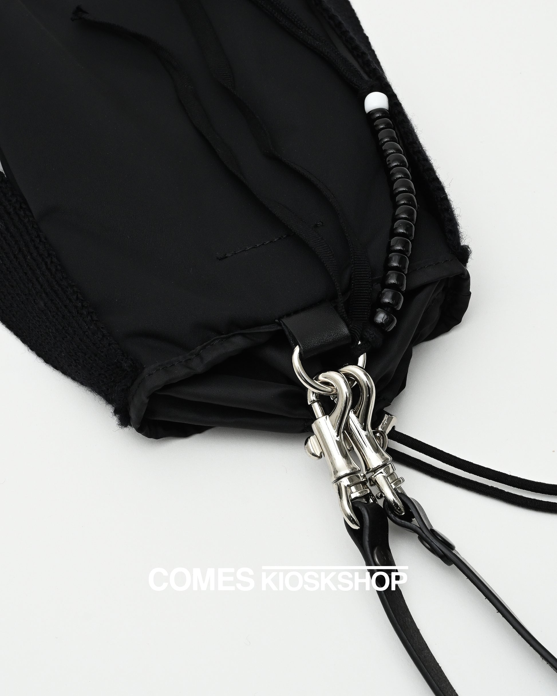 左右にメリノウールの帯が垂れ下がり、後ろ部分には黒のビーズ15ヶと白のビーズ1ヶが連なった装飾、黒のグログランテープを無造作に垂らした装飾がつきます。